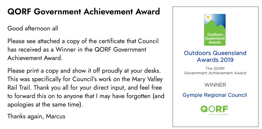 Tom D, Acting Manager, Gympie Regional Council (responding to my email upon his leaving)